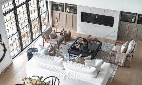 This Woodfield Design + Build home brings together the best of new & old-world architecture. The beautiful exterior elevation offers a grand street presence with a pronounced 2-storey chimney and oversized windows. The interior is loaded with unique design elements; a groin-vaulted ceiling, custom black metal staircase, floor-to-ceiling cultured stone kitchen backsplash.